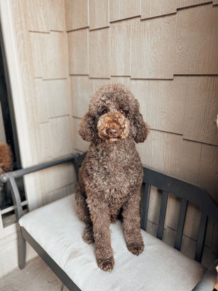Meet Meadow, she is a gorgeous AKC Poodle, weighing 43lbs. She has a gorgeous chocolate coat and an even sweeter button nose! She had one litter with us and is now retired, and lives in an amazing retirement home where she is spoiled to pieces.