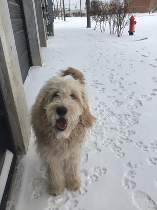 Meet Caroline, she is a multigen GoldenDoodle, weighing 40lbs, standing 21 inches at the withers. Caroline has a high golden retriever percentage of 38%, this shows in her stocky structure and happy go lucky personality. She is a very stable, calm, and confident girl, not bothered by anything. I absolutely adore her confidence and trusting nature. She is so sweet and loves to give kisses, she is also a professional snuggler. We can't wait for her first litter this year!